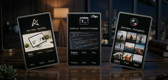 Your personal website, bio, or contact info on a smart NFC card. Fully customizable designs to fit your identity