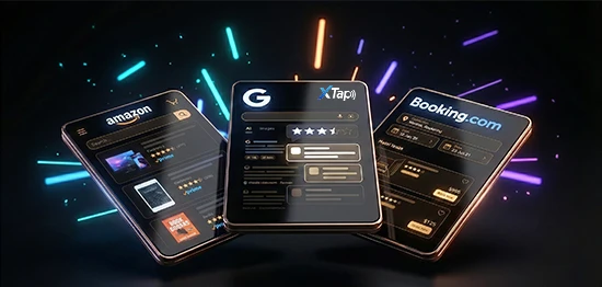 Smart NFC cards that showcase customer reviews instantly. Fully customizable designs for any business or platform