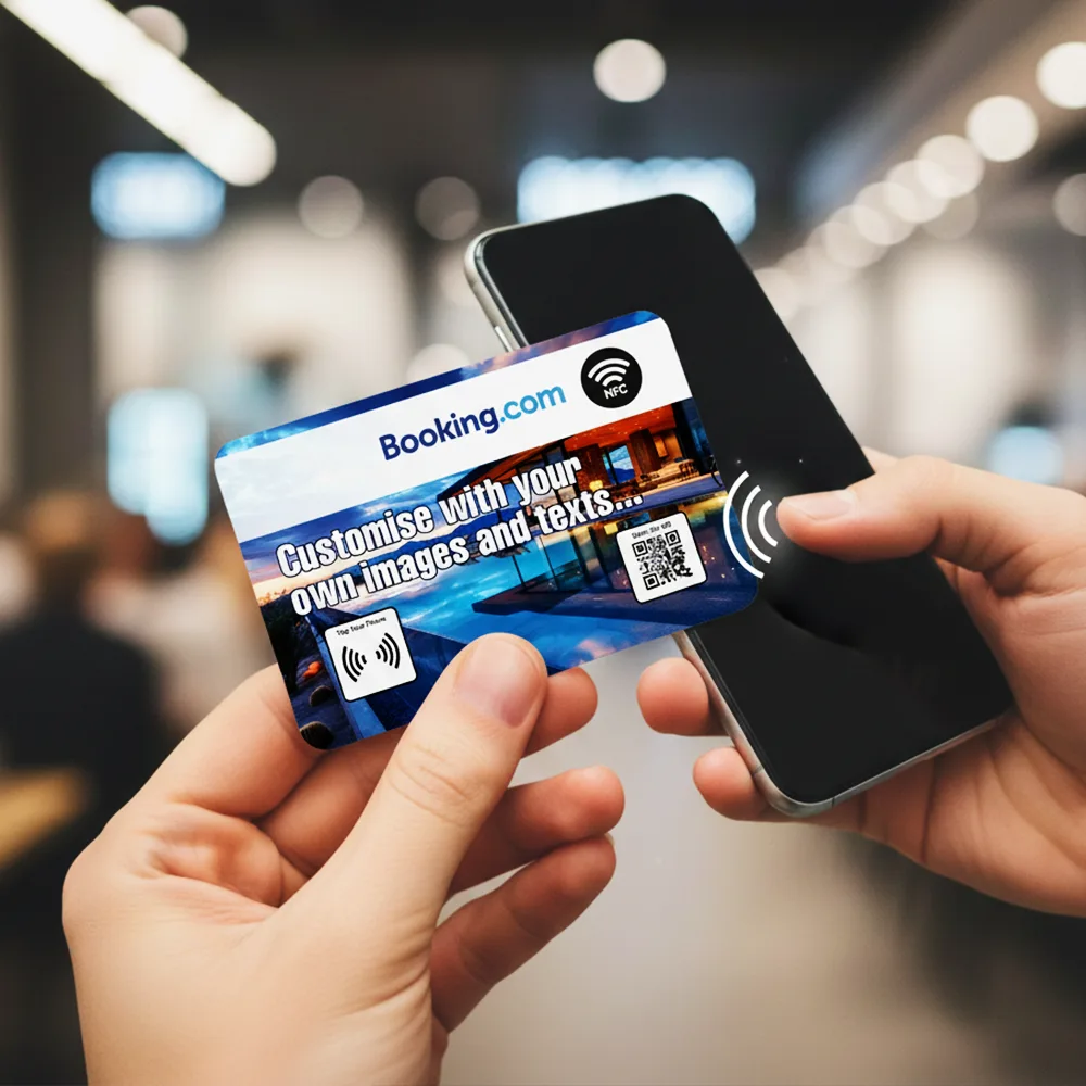 Built with advanced NFC technology, the card instantly opens your Booking.com review page on compatible iPhone and Android devices — no QR codes, apps or manual searching needed.